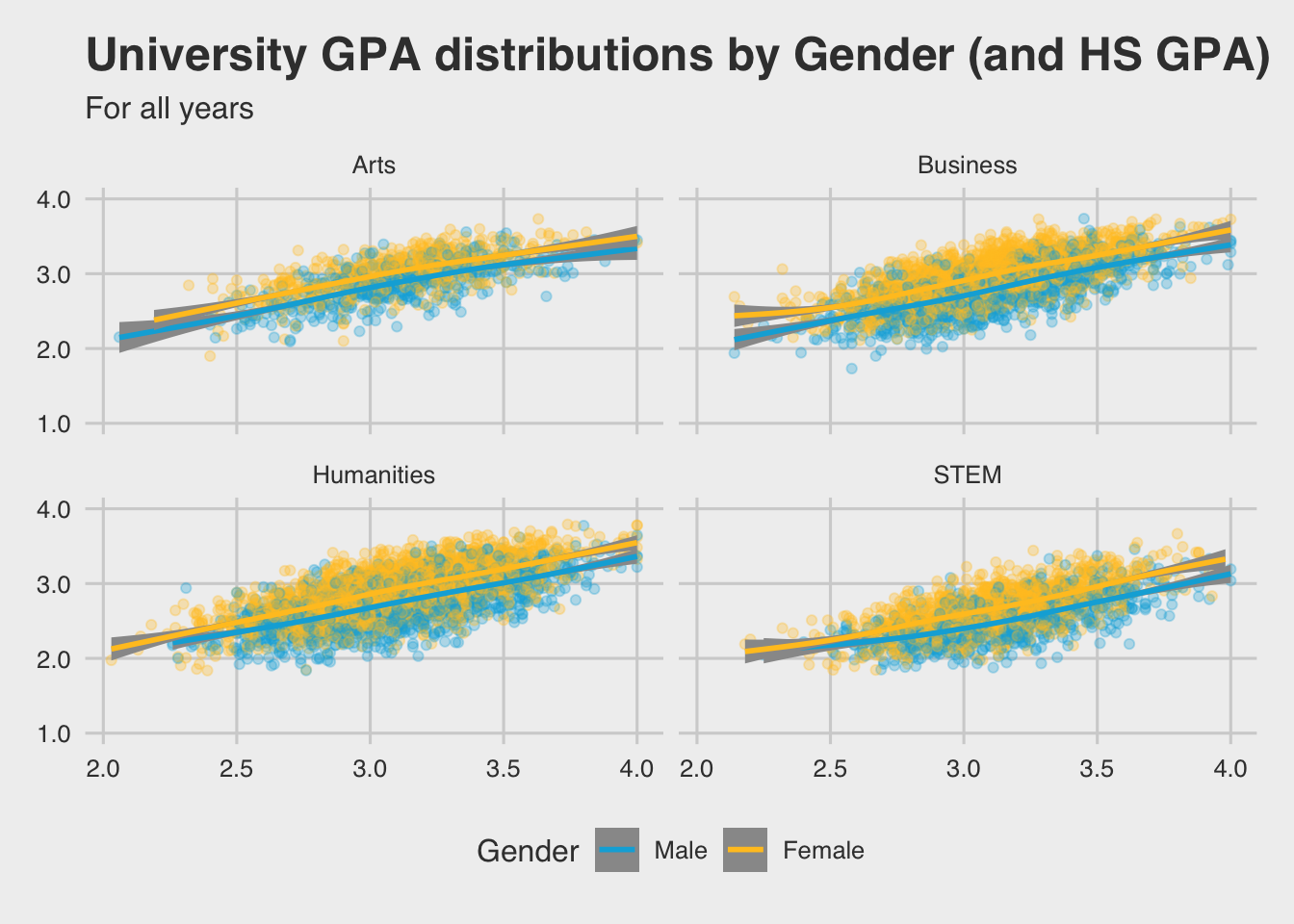 In this graph, we define a 4x2 grid of graphs based on the applicants possible major types and gender. In this default setup, each graph has the same x- and y-axes.